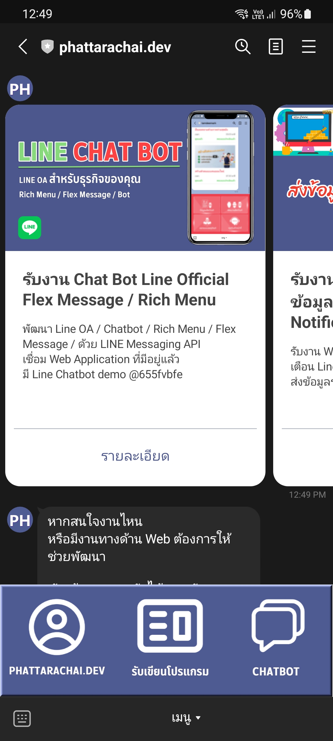 อันนี้เป็นตัวอย่าง Line Chat Bot ที่ผมทำขึ้นมาเพื่อสาธิตการใช้งาน Flex Message และ Rich Menu สามารถ Add line @655fvbfe เพื่อลองเล่นได้เลยครับ
